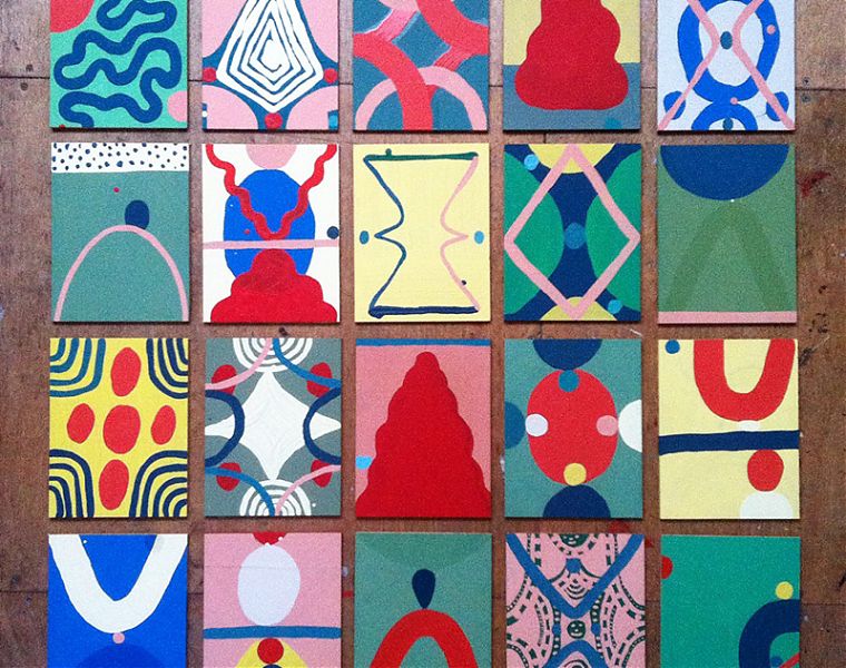 These small 16cm x 21cm paintings see me attempt to translate and make sense of lines, shapes and colours I keep revisiting through my collage and ceramic works over recent years.